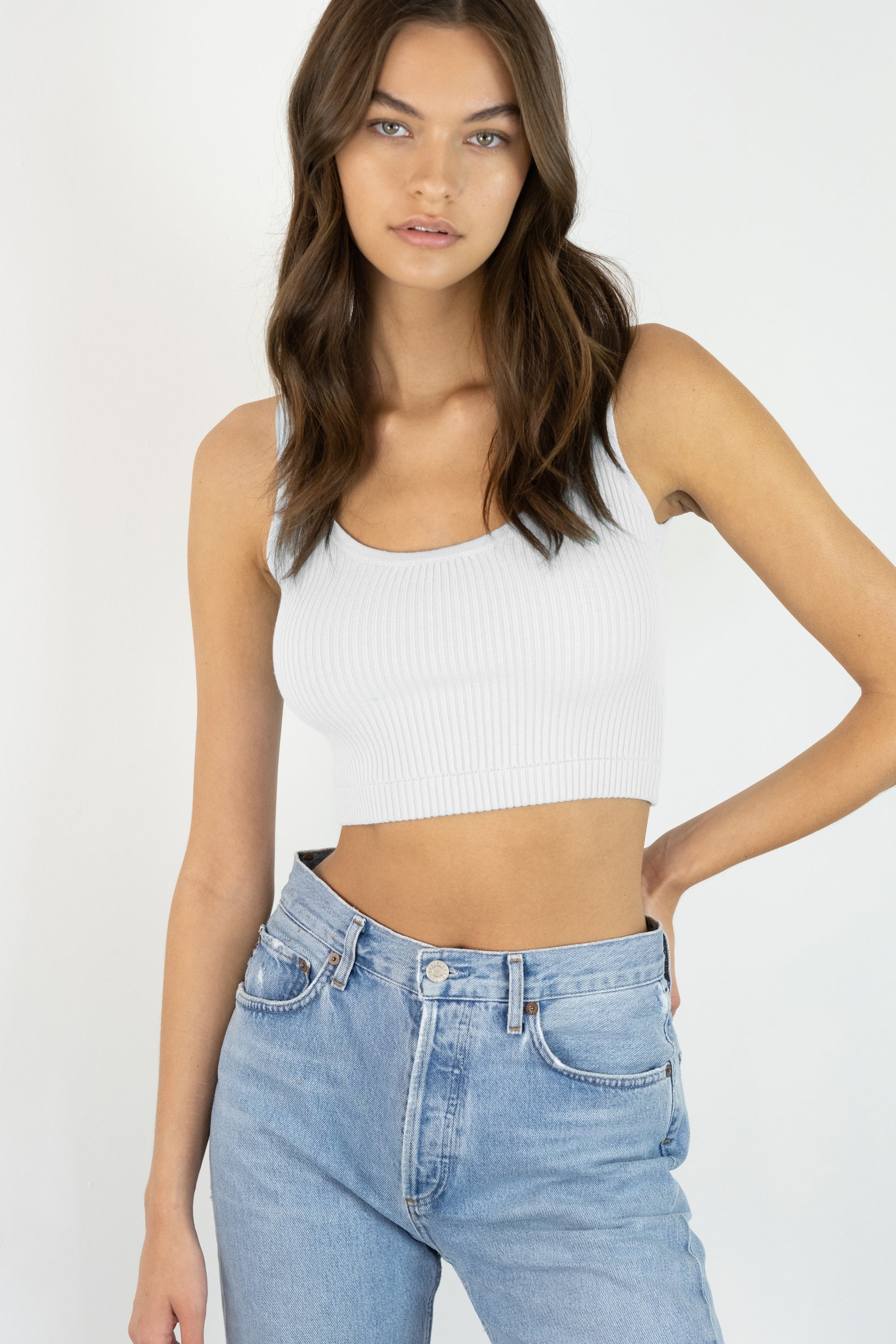 The Bardot Perfect Fit Crop is a fitted ribbed crop top designed to sculpt and flatter your silhouette with effortless style. Crafted from a soft luxury knit, this sleeveless cropped top features a classic scoop neckline and a supportive, body-hugging fit for all-day comfort. A versatile wardrobe essential, this elevated ribbed crop top pairs seamlessly with high-waisted bottoms for a polished, modern look.